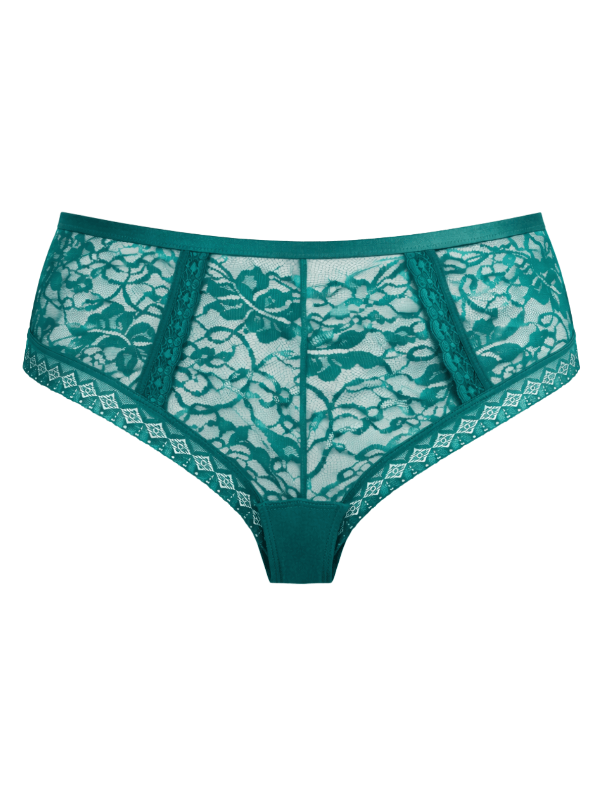High-rise, extra-cheeky jade lace panty with defining lace embellishments on the hips. Ultra sexy and ultra stretchy are the two key features of this style.