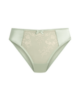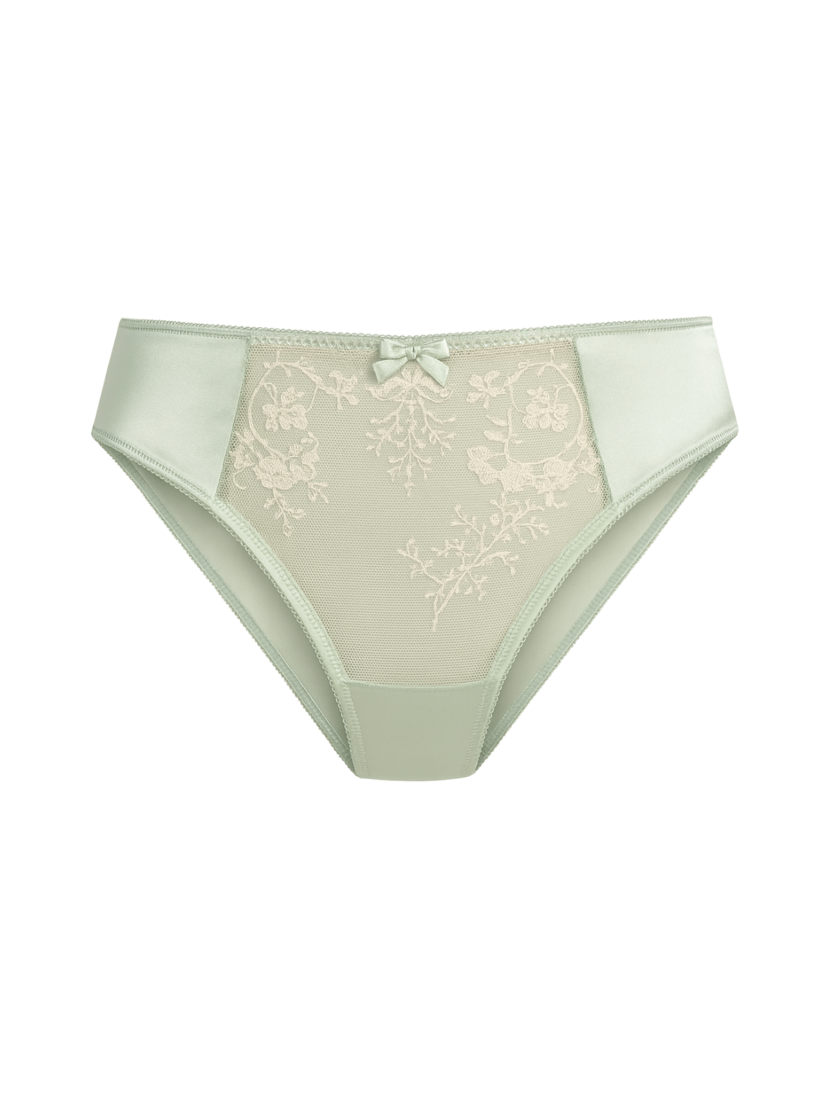 This matcha-inspired green is the luxury item you need in your underwear collection. Mesh, embroidered lace front-panel with a stretchy satin-like cheeky back.