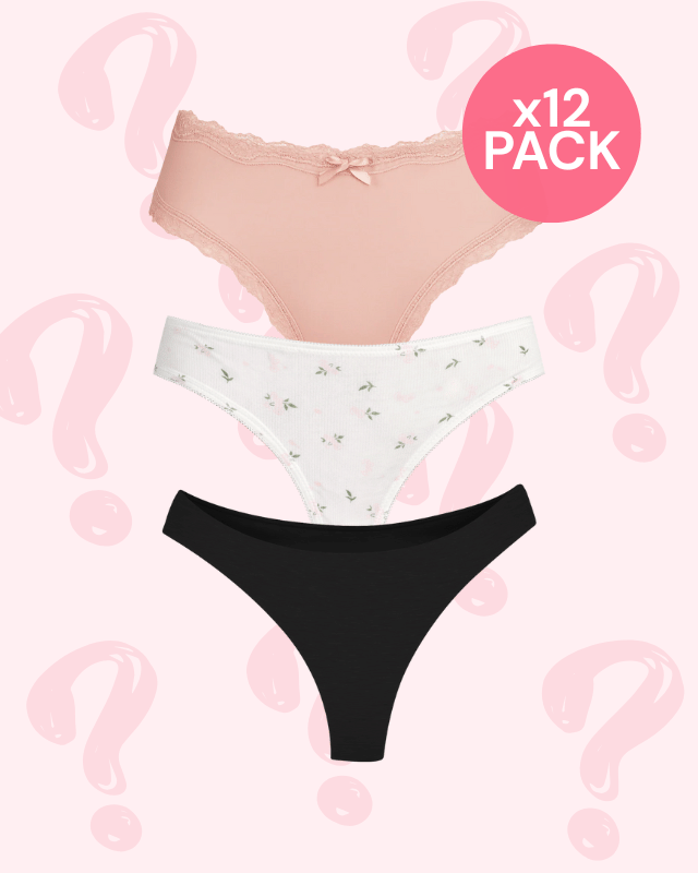 Each pack is a surprise assortment, so styles may vary from the images shown. Mystery bundles include a mix of silhouettes, with no guaranteed ratio between thong and non-thong styles. That’s part of the magic ✨