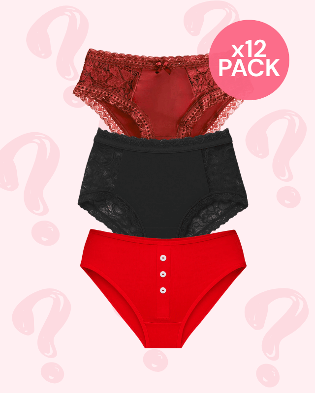 Our Mystery Period-Friendly 12-Pack includes twelve curated non-thong styles that offer both comfort and support during your cycle. You place the order, we do the picking—easy, fun, and totally unexpected.