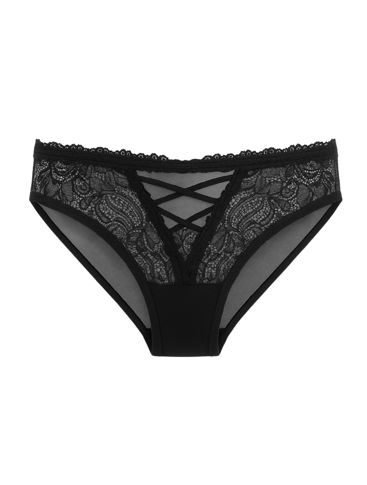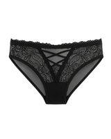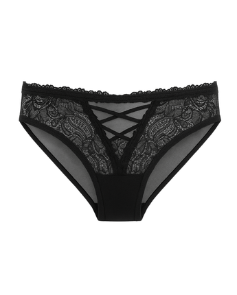 Sultry yet sophisticated, this black lace brief combines sheer floral lace with a flirty criss-cross front detail. Designed with soft stretch mesh and a smooth back for comfort, it’s the perfect mix of romantic and everyday wear.